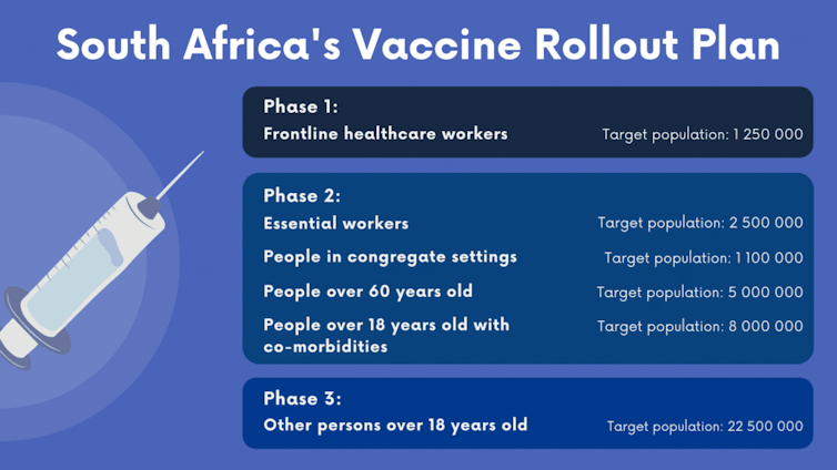 The second phase of the roll-out will be for essential workers like teachers, law-enforcement officers and those involved in food provision. It is expected to start in late April or early May 2021. Essential workers have an increased risk of exposure, due to the nature of their work. This phase will also include people living in congregate settings (where close contact within confined facilities increases exposure risk) such as prisons. Also included in the second phase are those older than 60 or with co-morbid diseases (a group at risk for severe disease).