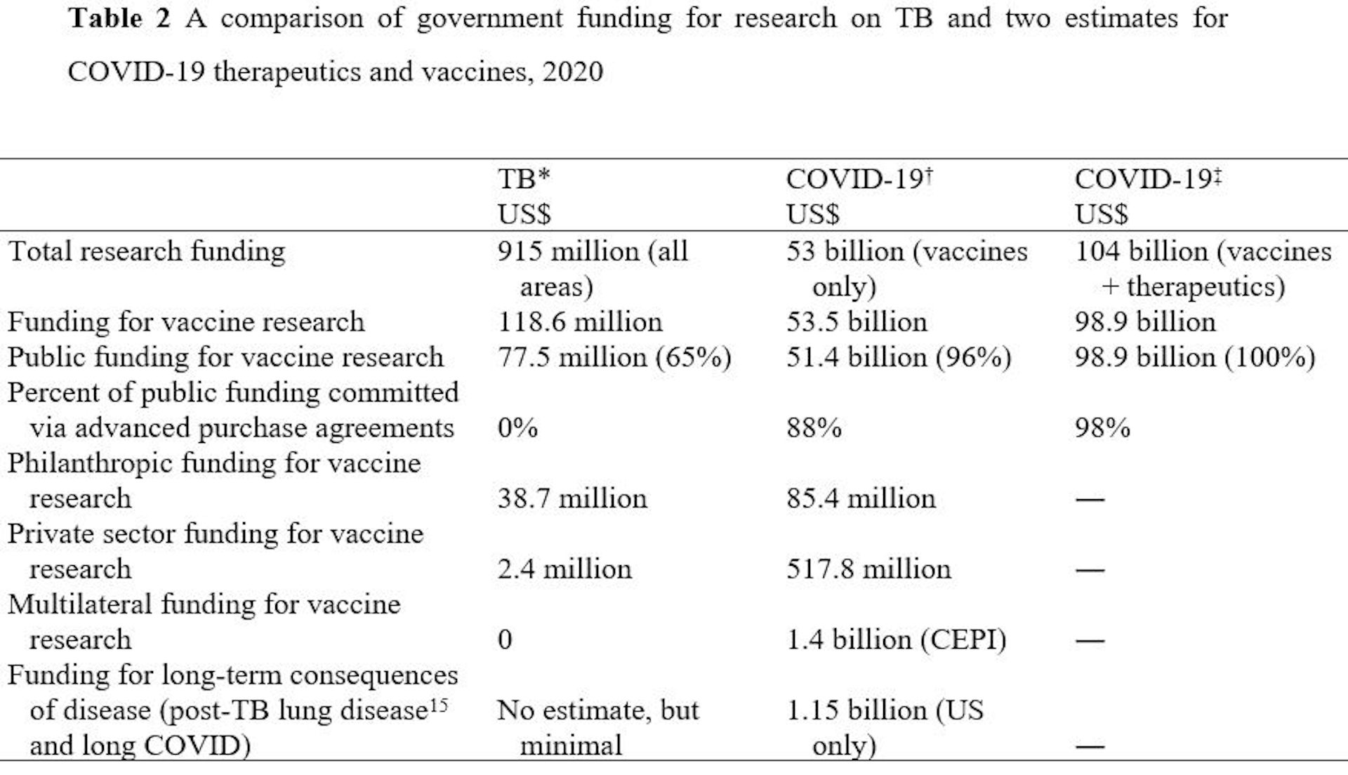 A comparison of investments in TB research versus research into COVID-19 is astonishing (Table 2).